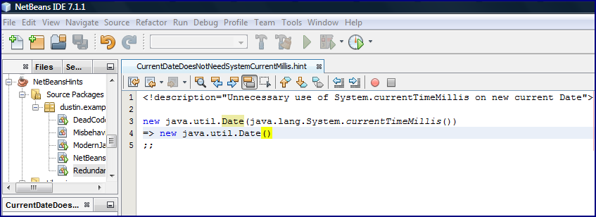 Как показано выше, простой пользовательский совет позволяет NetBeans идентифицировать, помечать и исправлять по моей просьбе ненужное использование System.curentTimeMillis (). Я писал ранее, что подсказки NetBeans настолько удобны, потому что на самом деле они делают три вещи для разработчика Java: автоматически отмечают области для улучшения кода для разработчика, часто автоматически исправляют проблему, если это необходимо, и сообщают о лучших способах написания Java , Для последнего преимущества в этом случае, наличие этой пользовательской подсказки помогает донести до других разработчиков Java немного больше знаний о классе Date и лучший способ создать его экземпляр, когда желательны текущая дата / время.