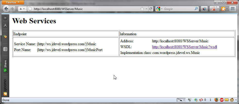<? xml version = "1.0" encoding = "UTF-8" ?> < endpoint implementation = "com.wordpress.jdevel.ws.Music" name = "Music" url-pattern = "/Music" /> </ endpoints > |