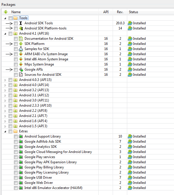 Строки, которые я пометил стрелкой, являются минимальными элементами, которые необходимо загрузить для начала работы. Конечно, здесь я представил свой менеджер SDK, в который я установил почти все. Но это занимает слишком много времени, и я знаю, что у всех вас не так много свободного времени. Так что просто загрузите отмеченные элементы и давайте отправим это шоу в дорогу !!!!