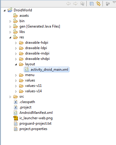res : эта папка содержит все ресурсы, необходимые для вашего приложения, такие как изображения и т. д. Вы можете классифицировать в соответствии с различными разрешениями экрана, языками и версиями ОС. Папка макета будет содержать файл XML, который позволяет вам определить элемент пользовательского интерфейса, специфичный для вашей деятельности. Папка values позволяет вам определять языковые записи таким образом, как мы используем .propertiesфайлы в обычных Java-приложениях для поддержки разных языков. Более подробную информацию можно найти здесь .