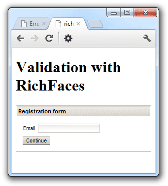 Готово? Еще одно развертывание, и вы, наконец, видите свое приложение. В основном RichFaces работает на WebLogic, но вы должны упаковать его в ухо и развернуть загрузчик классов для классов com.google.common. *. Это намного проще с PrimeFaces, но … в любом случае, есть причины, почему я попробовал это. Во-первых, мне нравится идея запуска проверки бинов на стороне клиента. Если вы посмотрите на пример, который вы видите, то <rich: validator event = ‘blur’ /> добавляет клиентскую валидацию как для ограничений валидации бина, так и для стандартных валидаторов jsf для клиента. Без необходимости возиться с чем-либо в JavaScript или дублировать логику.