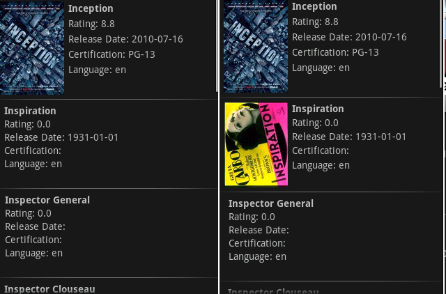 Запустите приложение и введите поисковый запрос. Когда активируется «MoviesListActivity», вы сначала увидите список с фильмами и соответствующей информацией. Постепенно различные изображения начнут появляться по мере их загрузки! Не забывайте, что эта операция в конце концов происходит в фоновом режиме. Обратите внимание, что некоторые фильмы, особенно старые, не имеют соответствующих миниатюр. Посмотрите на следующие фотографии: