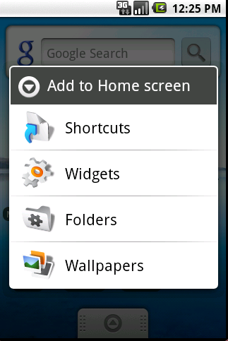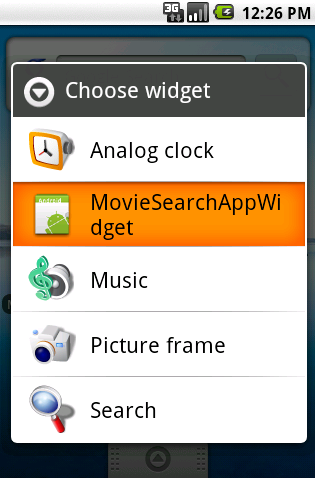 Теперь запустите соответствующую конфигурацию проекта Eclipse. Эмулятор, вероятно, доставит вас прямо к самому приложению. Скорее, нажмите кнопку назад, чтобы вернуться на домашний экран. Проверьте статью о том, как добавлять и удалять виджеты приложения . Для эмулятора, вы в основном должны нажать на пустую область и не отпускать кнопку мыши. Затем появится следующее диалоговое окно: