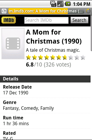 Наконец, если дважды щелкнуть название фильма, отложенное намерение будет запущено, и браузер Android запустится, направленный на страницу IMDB фильмов (обратите внимание, что некоторые фильмы не будут иметь связанных идентификатора IMDB и страницы. В этом случае браузер будет перенести вас на испорченную страницу IMDB).