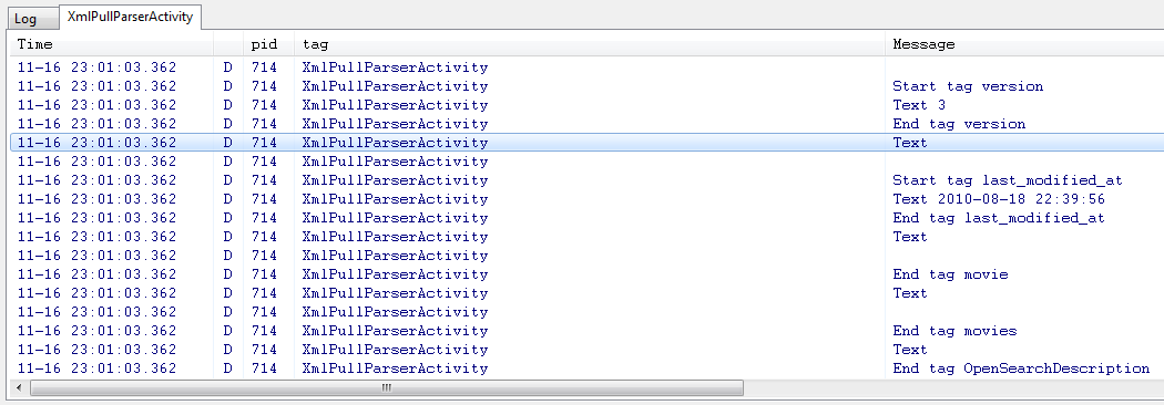 Код довольно прост, просто помните, что мы используем подход «детализации», чтобы проанализировать более глубокий элемент (фильмы? Фильмы? Изображения). Обратите внимание, что в методе разбора Movie мы включили только некоторые поля для краткости. Кроме того, не забудьте вызвать метод parser.nextText (), чтобы разрешить анализатору перемещать и извлекать следующий тег (иначе вы получите некоторые неприятные исключения, поскольку текущее событие не будет иметь тип START_TAG ).