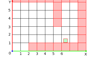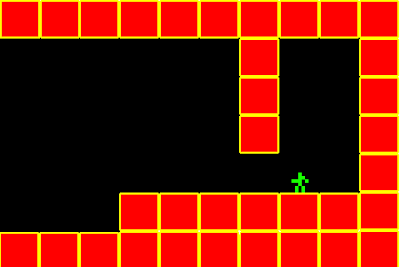 Красные квадраты — ограничивающие рамки блоков. Зеленый квадрат — это ограничительная рамка Боба. Пустые квадраты — это просто пустой воздух. Сетка только для справки. Это мир, в котором мы будем создавать наши симуляции. Источник системы координат находится внизу слева, поэтому ходьба влево со скоростью 10.000 единиц / час означает, что координата X позиции Боба будет уменьшаться на 2.7 единиц каждую секунду .