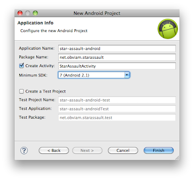 . Для цели сборки отметьте «Android 2.3». Укажите имя пакета net.obviam