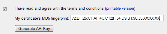 Этот отпечаток мы должны предоставить службе Google Maps. Теперь мы готовы зарегистрироваться для получения ключа, посетив страницу регистрации ключей API Карт Android . После того, как мы прочитаем и примем условия, мы предоставляем сгенерированный отпечаток пальца следующим образом: