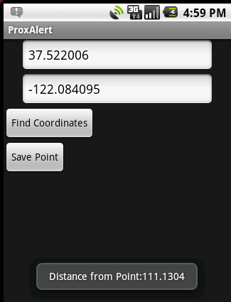 <? xml version = "1.0" encoding = "utf-8" ?> android:orientation = "vertical" android:layout_width = "fill_parent" android:layout_height = "fill_parent" > < EditText android:id = "@+id/point_latitude" android:layout_width = "fill_parent" android:layout_height = "wrap_content" android:layout_marginLeft = "25dip" android:layout_marginRight = "25dip" /> < EditText android:id = "@+id/point_longitude" android:layout_width = "fill_parent" android:layout_height = "wrap_content" android:layout_marginLeft = "25dip" android:layout_marginRight = "25dip" /> < Button android:id = "@+id/find_coordinates_button" android:text = "Find Coordinates" android:layout_width = "wrap_content" android:layout_height = "wrap_content" /> < Button android:id = "@+id/save_point_button" android:text = "Save Point" android:layout_width = "wrap_content" android:layout_height = "wrap_content" /> </ LinearLayout > |