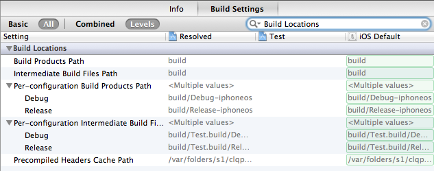 «Как мне это исправить?», Спросите вы. Ну, я тоже об этом спрашивал, и мне потребовалось несколько дней, чтобы наконец понять это. Помните, что Xcode 4 больше не показывает этот путь в своих настройках Build Locations, так что это, очевидно, не продвигает нас дальше.