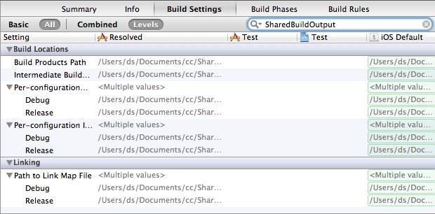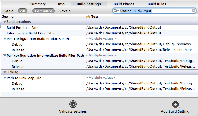 В моей почтенной настройке Xcode 3 я настроил вывод для общей сборки в / Users / ds / Documents / cc / SharedBuildOutput.