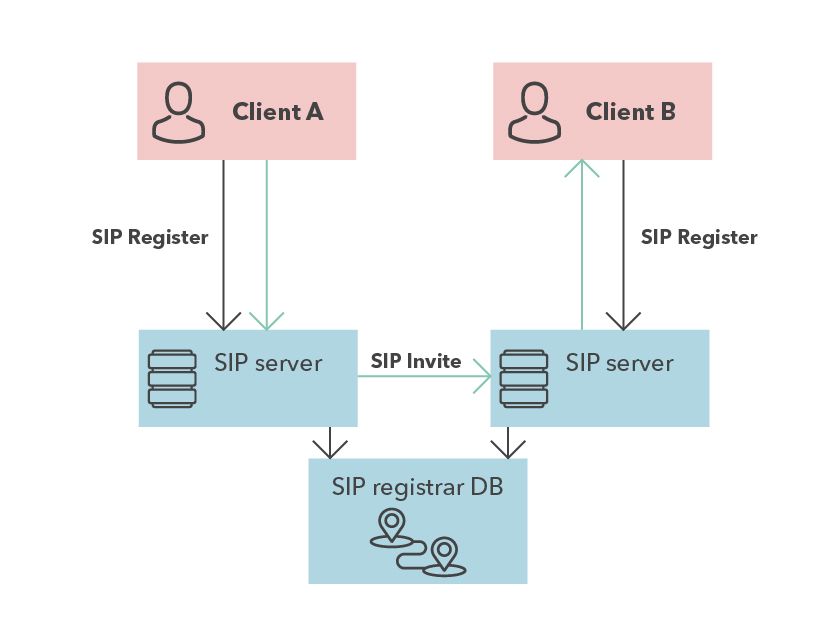 Как и при обычных аналоговых вызовах, для VoIP требуется УАТС, чтобы пользователи могли найти друг друга по определенному номеру телефона и преодолеть проблему, вызванную отсутствием белого IP-адреса клиента. После того, как клиенты нашли друг друга и согласовали кодеки, необходимо установить соединение для медиапотока. В зависимости от требований проекта и конфигурации сети поток данных может идти либо напрямую от клиента к клиенту, либо через сервер.