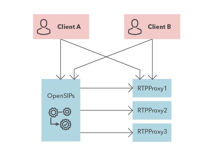 Балансировщик нагрузки SIP, представленный OpenSIP или Kamailio, управляет RTP-прокси или его эквивалентом. Связь между ними осуществляется по определенному протоколу (не SIP), в рамках которого балансировщик нагрузки должен иметь возможность запрашивать распределение портов для протокола RTP для отправки этих данных клиентам. Клиент открывает новое соединение по полученному IP и порту, подключаясь к прокси RTP.