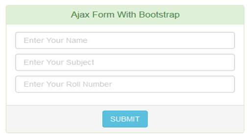<!DOCTYPE html> <html> <head> <title>Jquery AjaxForm With Bootstrap Style</title> <link rel="stylesheet" href="./css/bootstrap.min.css"> <link rel="stylesheet" href="./css/my-style.css"> </head> <body> <form id="my-detail-form"> <div class="panel panel-success"> <div class="panel-heading"> <h3 class="panel-title">Ajax Form With Bootstrap</h3> </div> <div class="panel-body"> <div class="alert alert-warning my-message-error"> <a href="#" class="alert-link">...</a> </div> <div class="alert alert-success my-message-success"> <a href="#" class="alert-link">...</a> </div> <input name='name' type="text" class='form-control' placeholder="Enter Your Name"> <input name='subject' type="text" class='form-control' placeholder="Enter Your Subject"> <input name='roll' type="text" class='form-control' placeholder="Enter Your Roll Number"> </div> <div class="panel-footer"> <button type="submit" class="btn btn-info">SUBMIT</button> </div> </div> </form> <script src="lib/jquery-1.10.1.min.js"></script> <script src="lib/jquery.form.min.js"></script> <script src="my-form-script.js"></script> </body> </html>